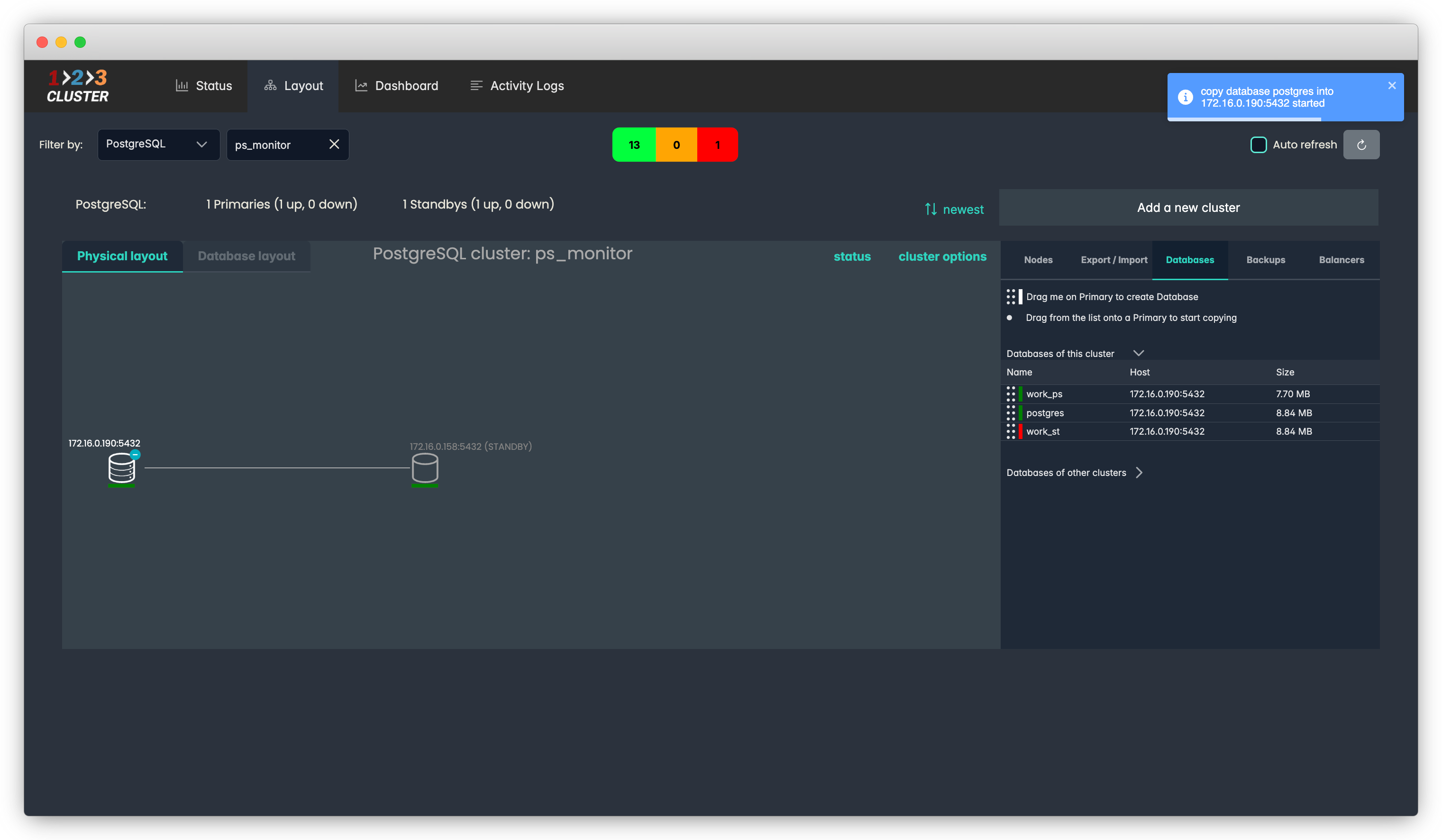 Drag the ::| icon located near 'postgres' database onto the Primary node.
